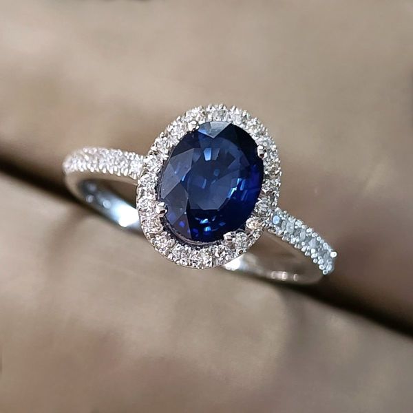 Experience royalty with this stunning sapphire halo ring. A deep blue oval sapphire is embraced by a sparkling halo of round diamonds, all set in lustrous 18K white gold.