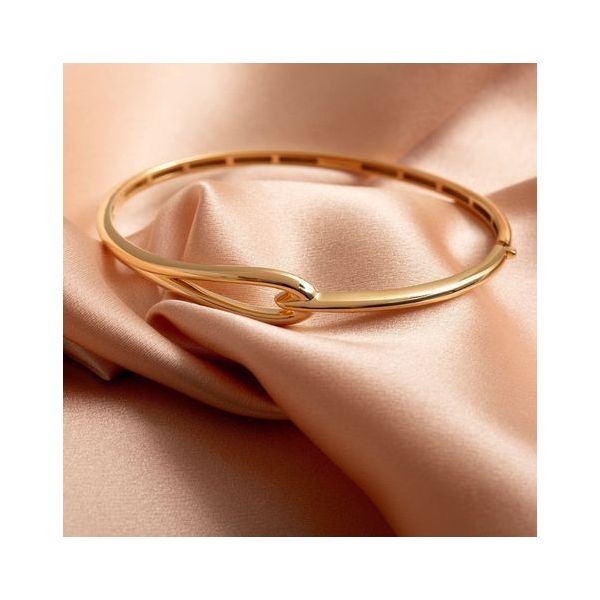 This elegant bangle bracelet is crafted from solid 14K yellow gold with a smooth, polished finish. The hinged design with secure clasp makes it easy to wear. Perfect for stacking or wearing alone.