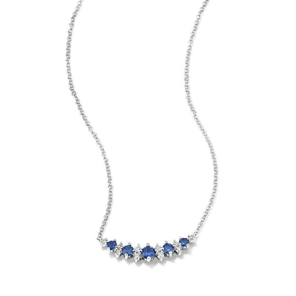 This contemporary bar necklace features a row of vibrant blue sapphires set horizontally in 18K white gold. The minimalist design makes it perfect for layering or wearing alone. Chain length: 17 inches.